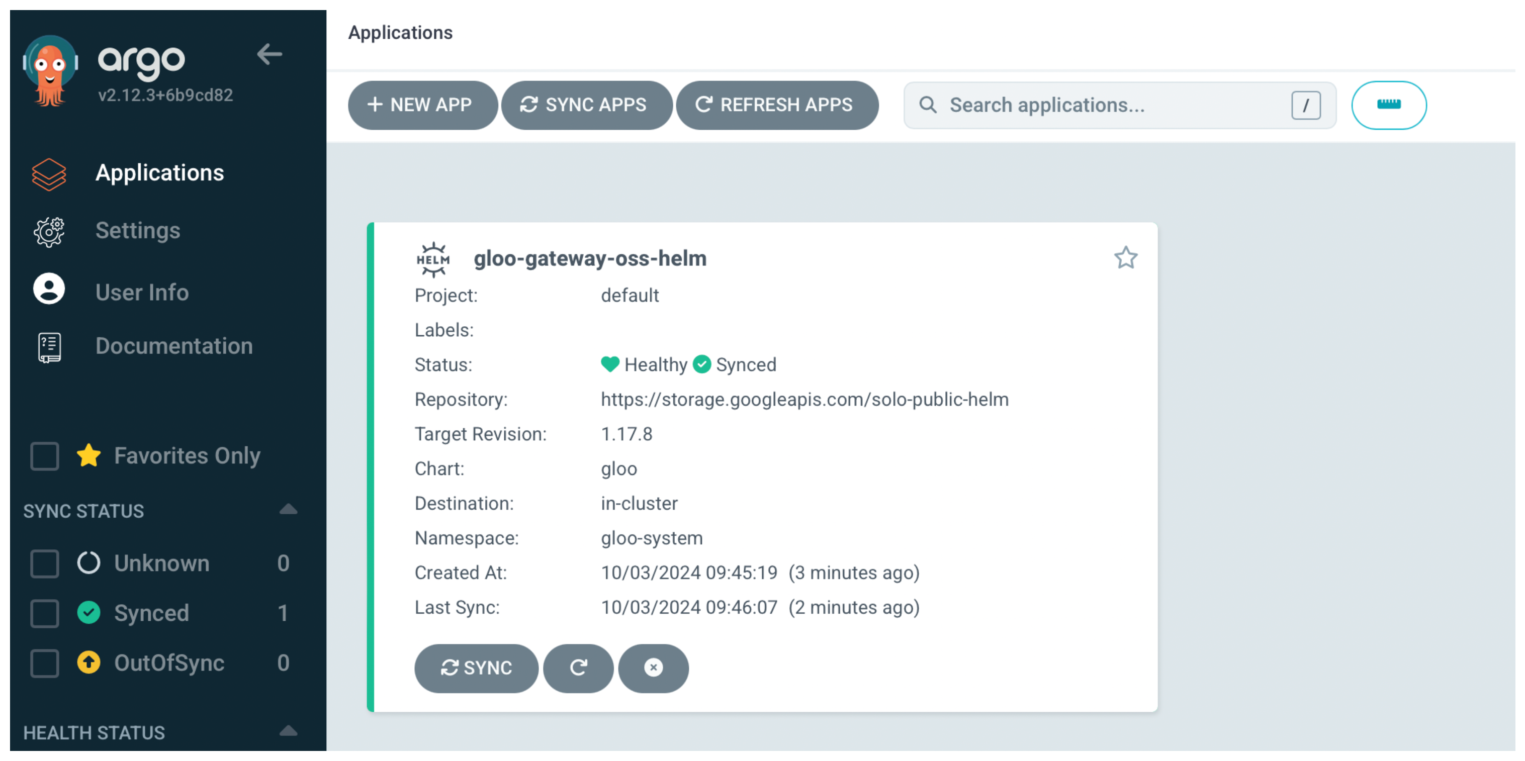 Open the Argo CD UI and verify that you see the Argo CD application with a